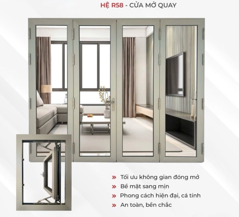 Cửa nhôm hệ R58 sử dụng cơ chế mở quay bằng bản lề, cho phép cánh cửa mở rộng tối đa khi sử dụng. Thiết kế này giúp tối ưu không gian đóng mở, thuận tiện cho việc lưu thông không khí và ánh sáng vào bên trong phòng.